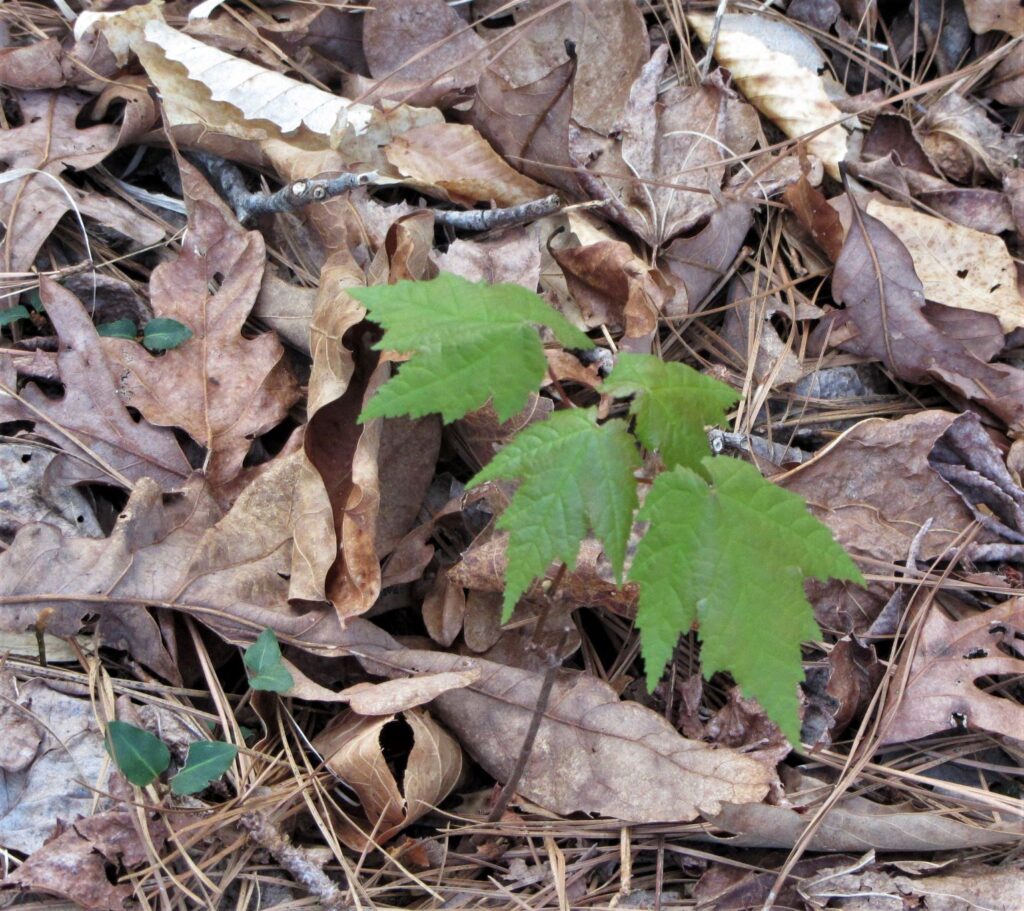The easiest, most cost-effective, but least reliable method is to wait for tree seedlings to emerge.  Squirrels and blue jays may hide acorns, beech nuts, hickory nuts, or other nuts that eventually germinate and grow.  If these emerge in the ‘wrong’ place you can dig and translate them to your emerging tiny forest.  Some seeds, like holly and Magnolia, must pass through a bird’s system, or be treated with strong acid, before they will germinate.  Collecting and planting these seeds would have a very low germination rate. So, watch for these species to emerge from seeds dropped by the birds.  Some seeds, like red maple or pine seeds, may blow in on the wind.