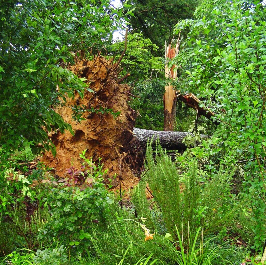 We ran out to investigate in the pouring rain, thunder still crashing nearby, and found our oak tree fallen across the yard and blocking the street.  Another old oak was twisted off about 15’ up its trunk, with many smaller trees and shrubs lying under their debris.  We lost so many trees that day that the entire character of our yard was transformed.