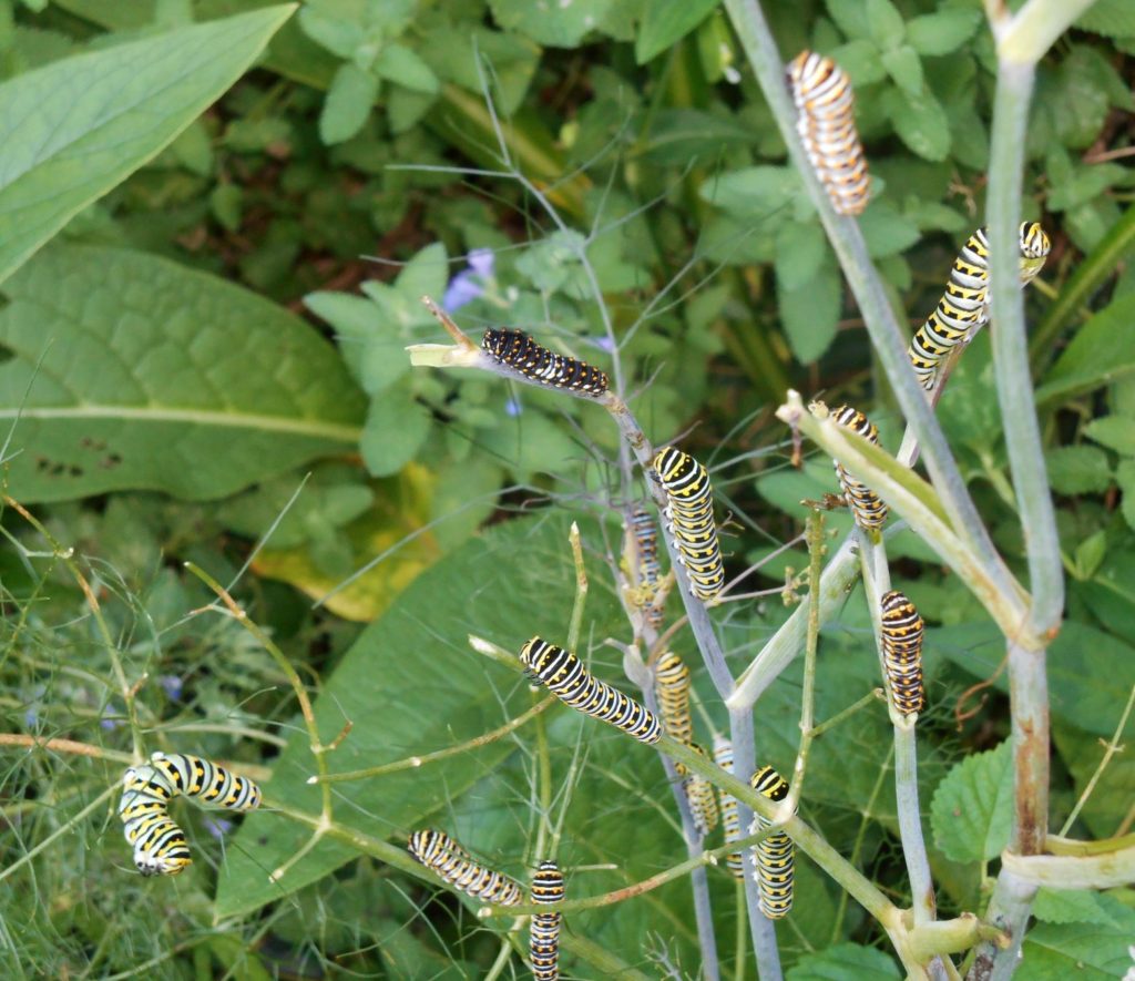 Black Swallowtail cats feed on fennel. Notice that they change color as they grow.