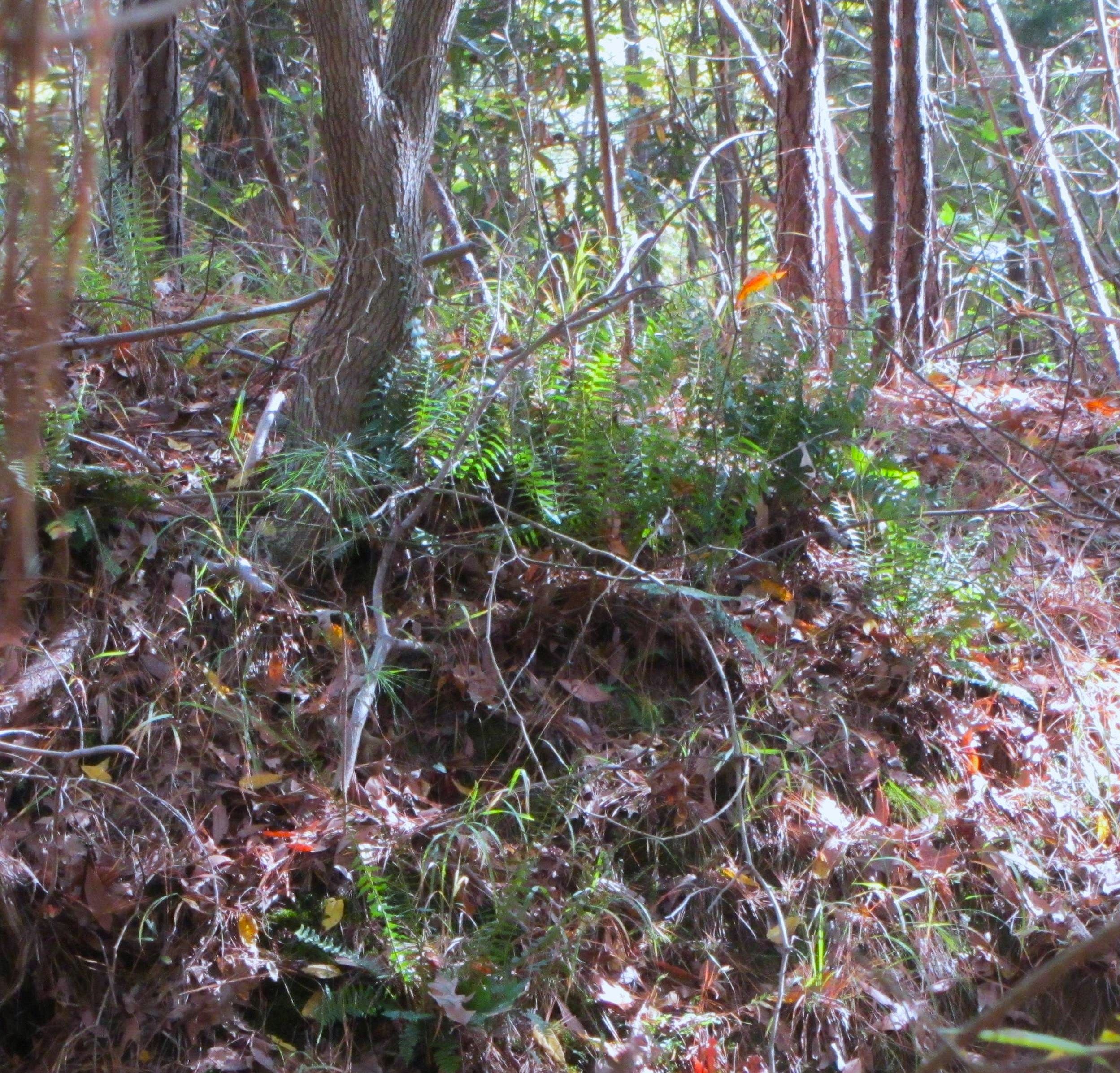 Shaggy Wood fern, D. subatrata, center front, forms a large, vase shaped evergreen clump of shiny fronds throughout the year.