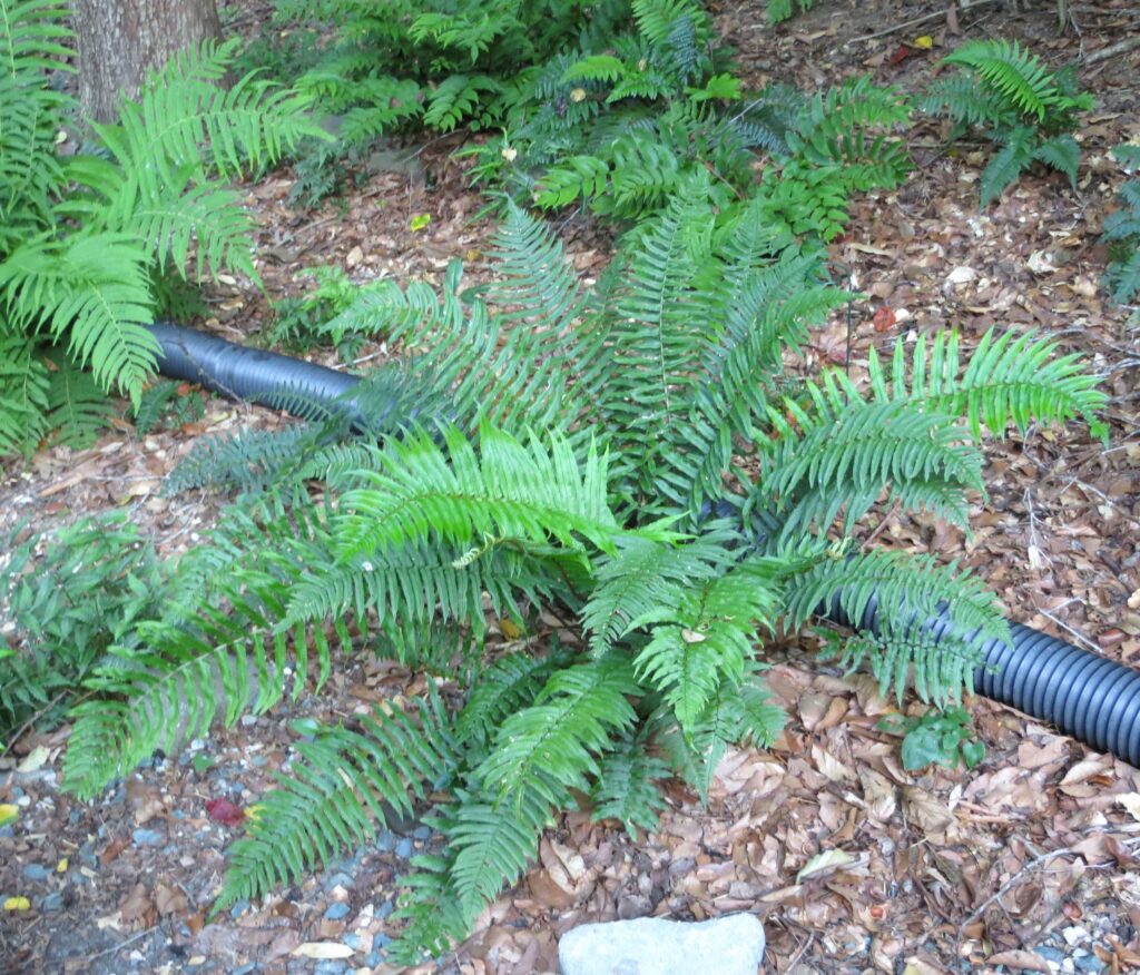 C. fortunei, Fortune’s holly fern, grows beside a Christmas fern on a shady bank to help control storm water erosion.