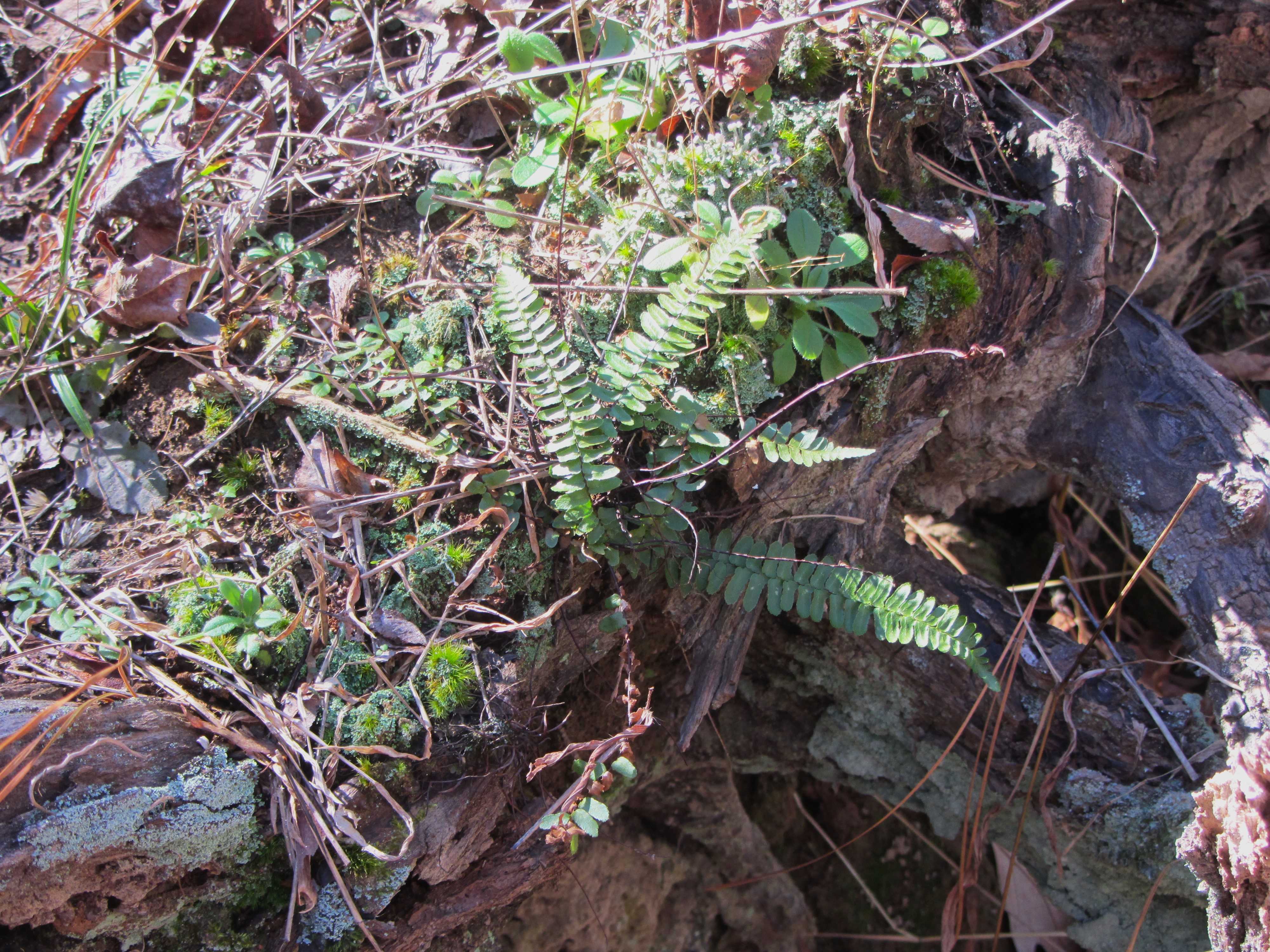 Native ebony spleenwort grows from patches of moss on the roots of a fallen tree on Jamestown Island.