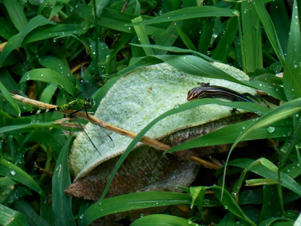 Since the flowers attract many small pollinating insects, a zipper spider weaves her web nearby, growing larger and larger each week as she feeds. Even small skinks and box turtles are attracted to the puddles left after watering, and an occasional toad will burrow into the cool damp soil of a low pot.