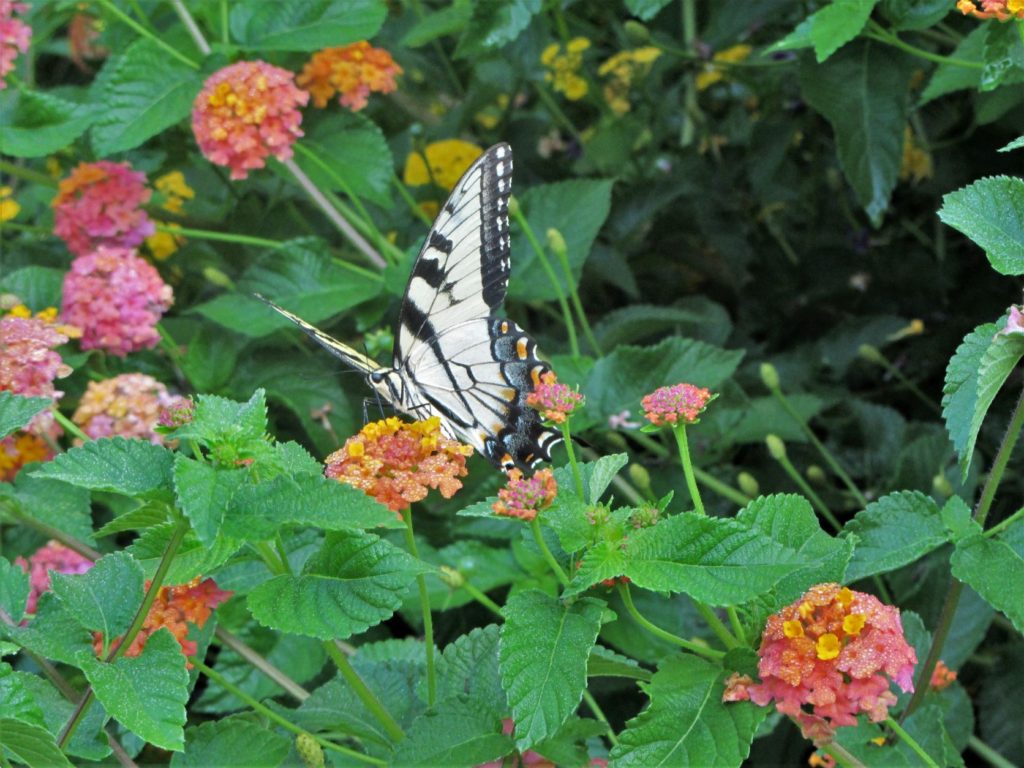 We plant a variety of flowering plants near our windows to attract butterflies, hummingbirds, native bees, and songbirds to feed. Even on the hottest summer afternoons, we can stand near the patio windows and watch hummingbirds flit from blossom to blossom. Butterflies float across the yard, resting on a hanging basket or pot for a few sips of nectar before moving on. Songbirds land on the pots, too, often looking for an insect to eat or pinching a bit of coco fiber from a basket liner. They forage for drupes among the Lantana and for seeds ripening on basil and on other flowering plants.