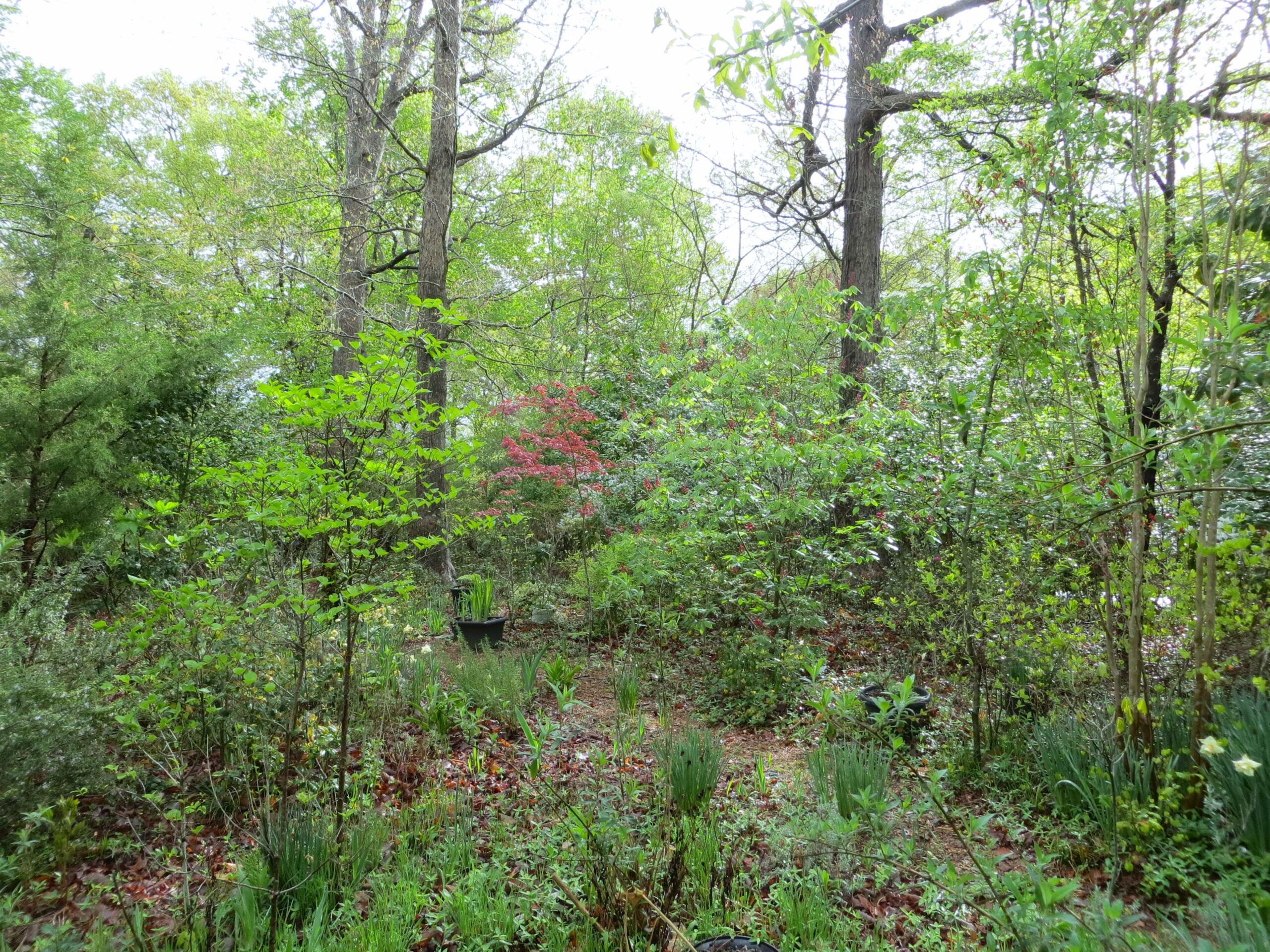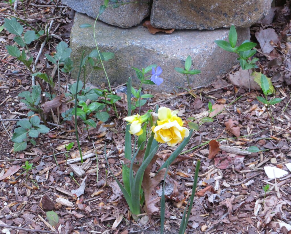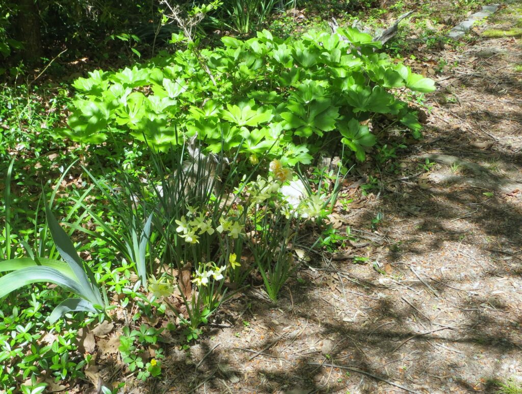 Narcissus bloom alongside a naturalized stand of mayapples, Podophyllum peltatum. Native strawberries, Fragaria virginiana, also bloom yellow and will later feed small animals. Deer have grazed the struggling Azalea to a point where it is barely still alive.