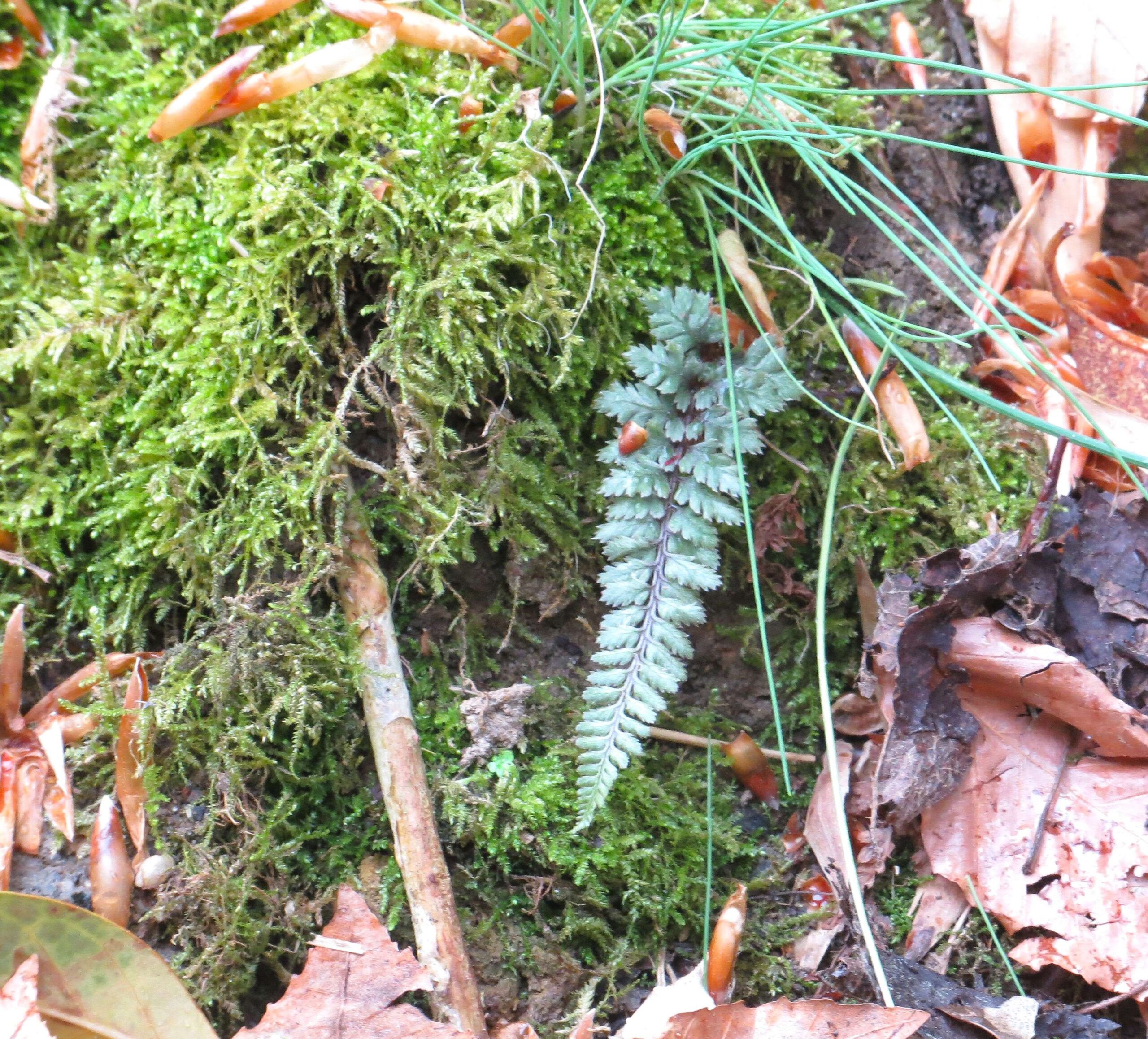 I’ve found several sporeling Japanese painted ferns emerging along the edges of paths and even in the lawn this spring. One leaf is poking out of the mossy side of a ‘step’ in an uphill path. A tiny Dryopteris sporeling has unfolded three fronds through the moss under a large fig tree. I watch for these fern babies, as I also watch for hellebore seedlings growing where they might be mown down in a few weeks, and I transplant them to safer spaces.