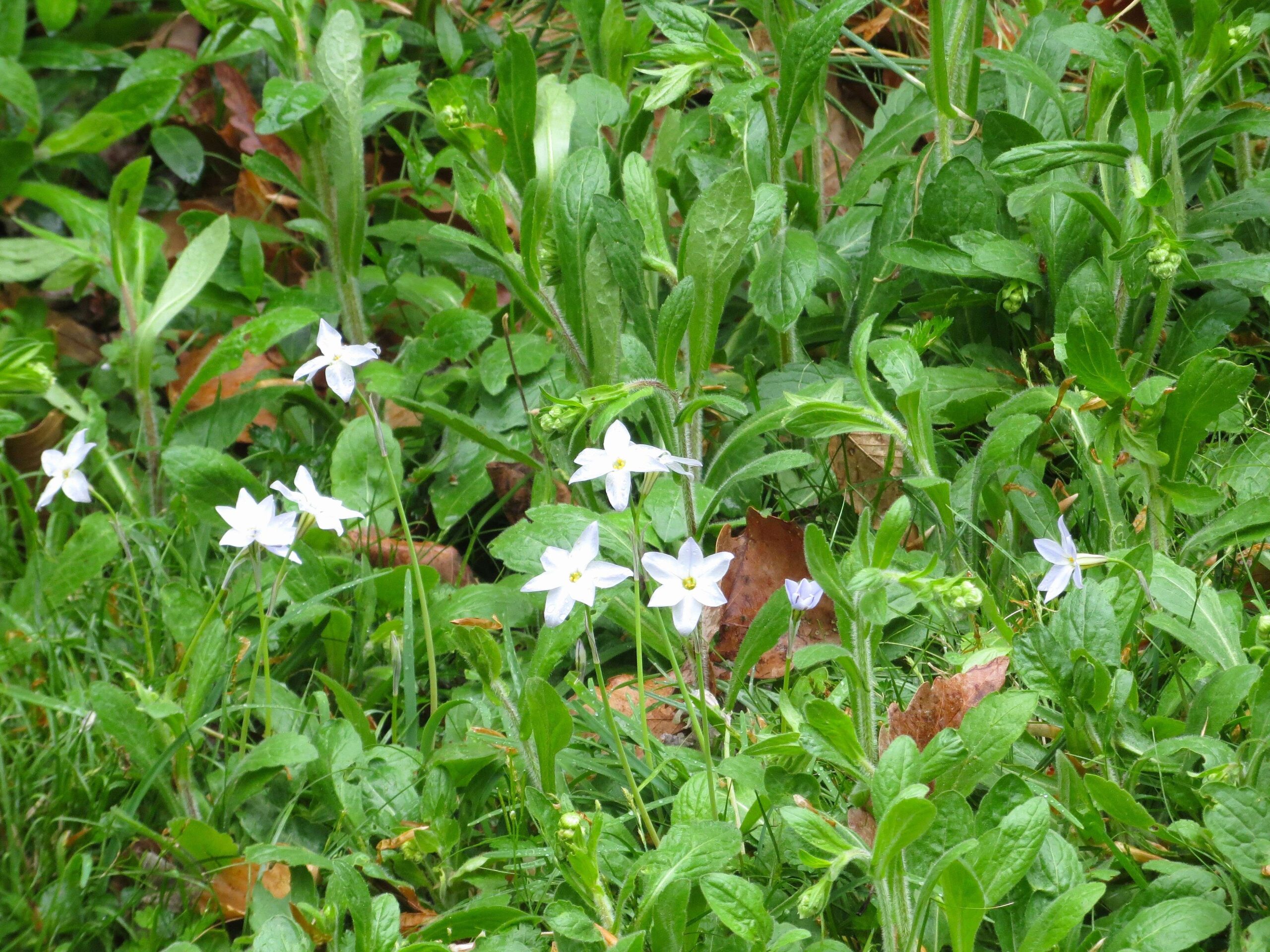 Naturalized Ipheion uniflorum, a South American native which grows from bulbs, emerges in our front lawn alongside native fleabane, Erigeron pulchelllus. The fleabane is pretty in bloom, but spreads itself so much it has nearly taken over the grass and now emerges in several containers. It is beloved by pollinators. This is one of those native wildflowers I pulled as a ‘weed’ when we first came to this garden.