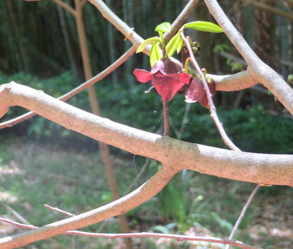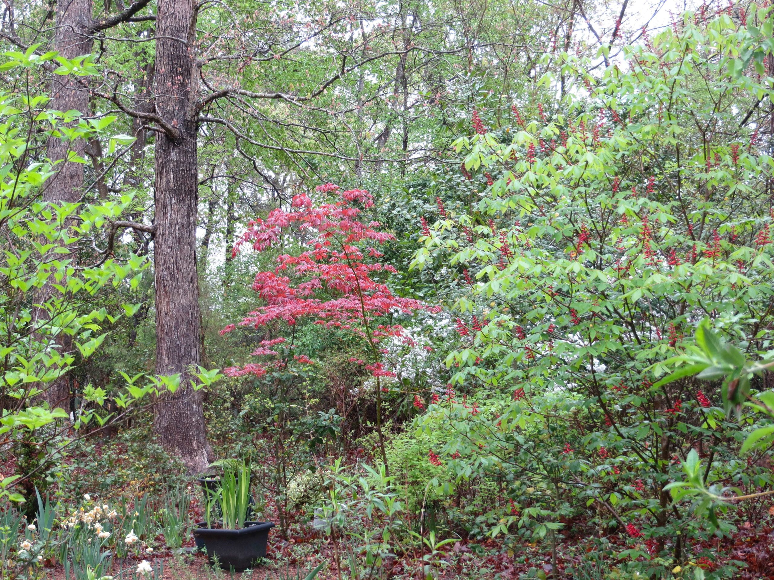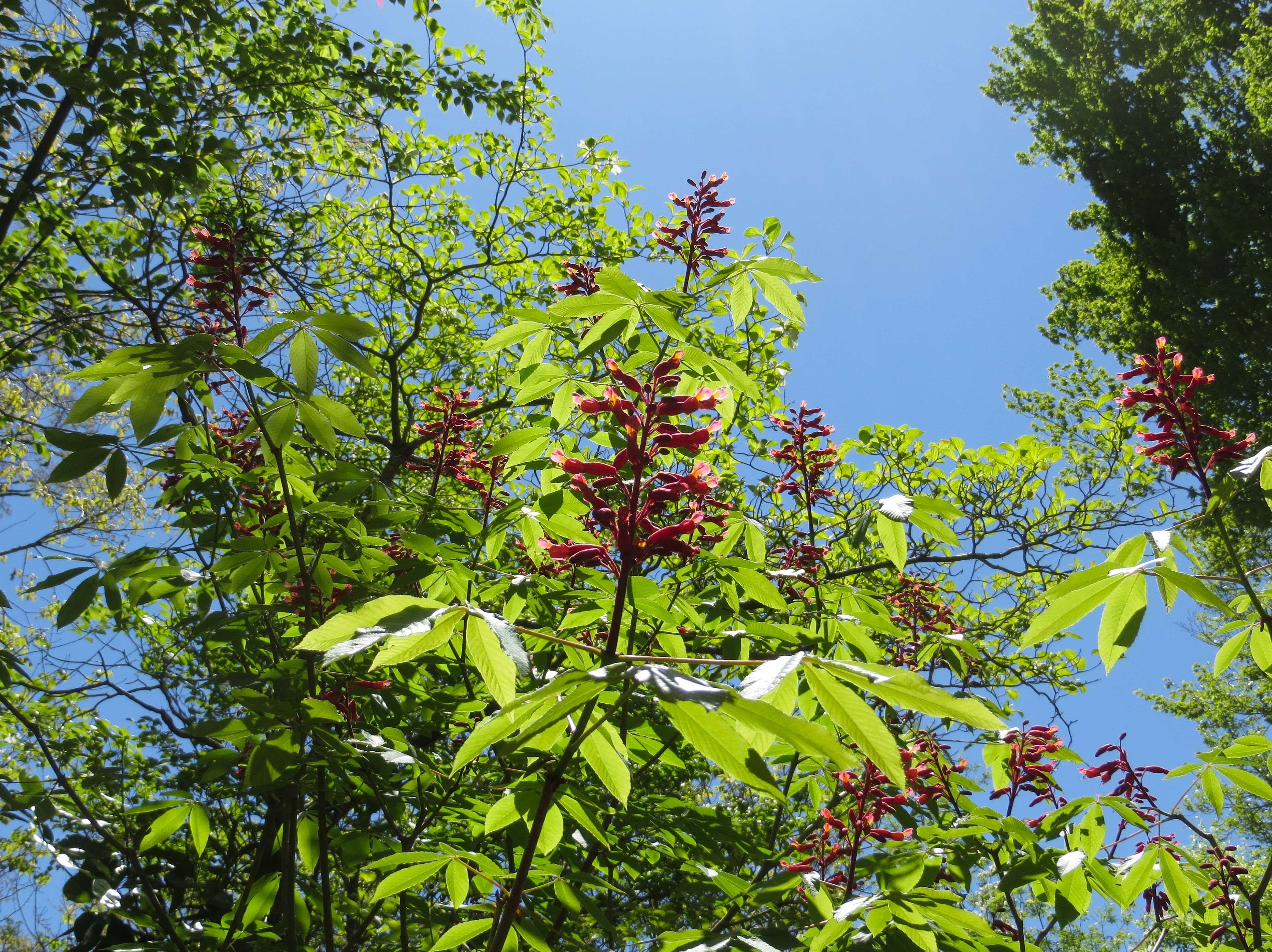 Scarlet buckeye trees need a warmer climate than Williamsburg enjoyed during the Colonial era. They have naturalized northwards in recent years, blooming in time to feed the earliest hummingbirds each spring. The several trees in our yard are all volunteers, likely planted by squirrels hiding nuts in autumn.