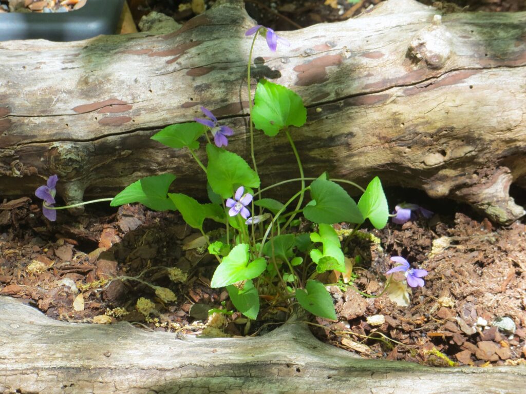 Common native wood violets self-seed throughout our yard. I transplanted this clump into a new ‘stump garden’ bed bordered by pieces of a fallen apple tree. Reusing fallen wood help recycle the nutrients in the wood back into the garden while providing habitat for insects and other small animals.