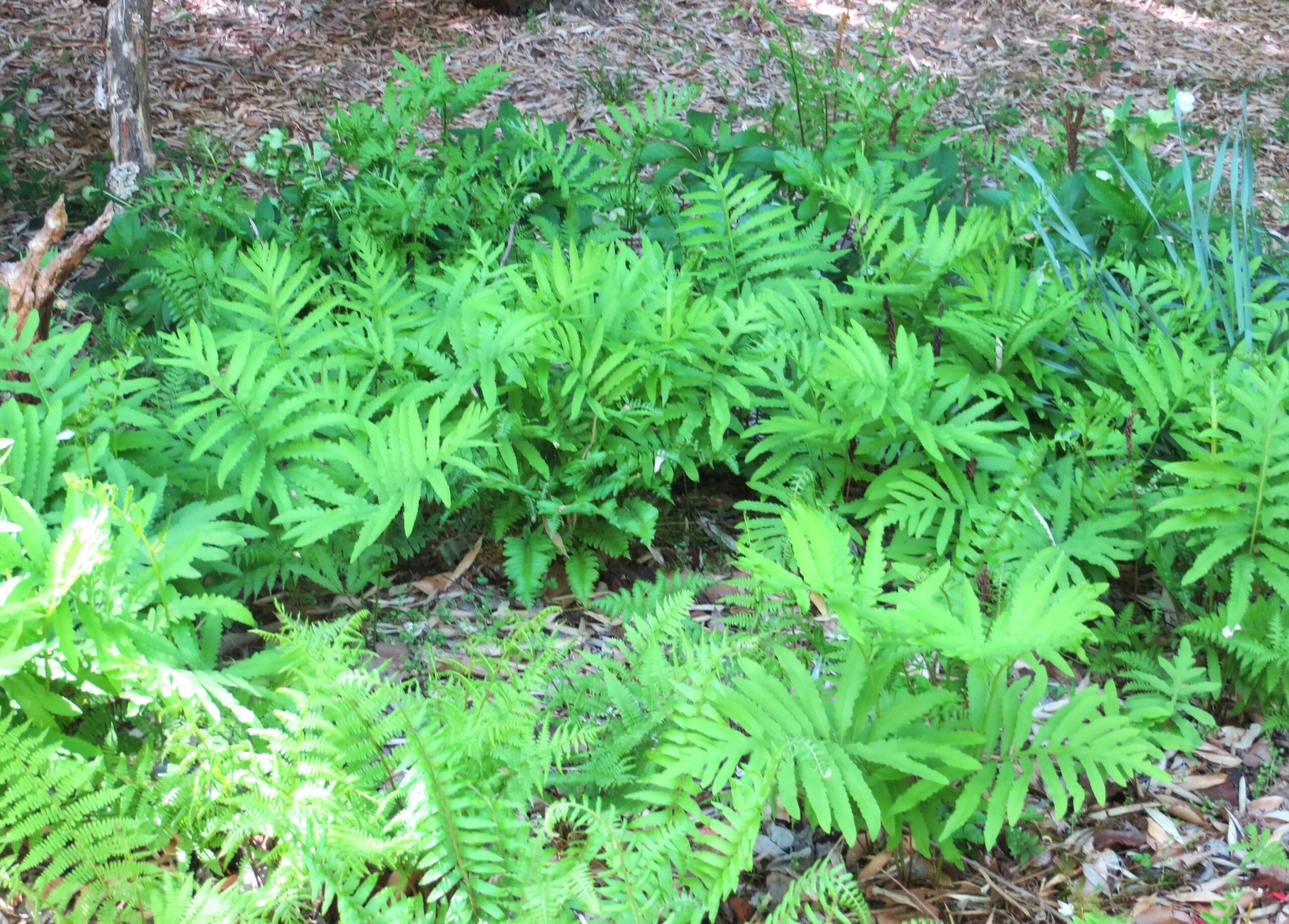 A variety of native ferns, including sensitive fern, Onoclea sensibilis, and Christmas fern, Polystichum acrostichoides, colonize this slope.