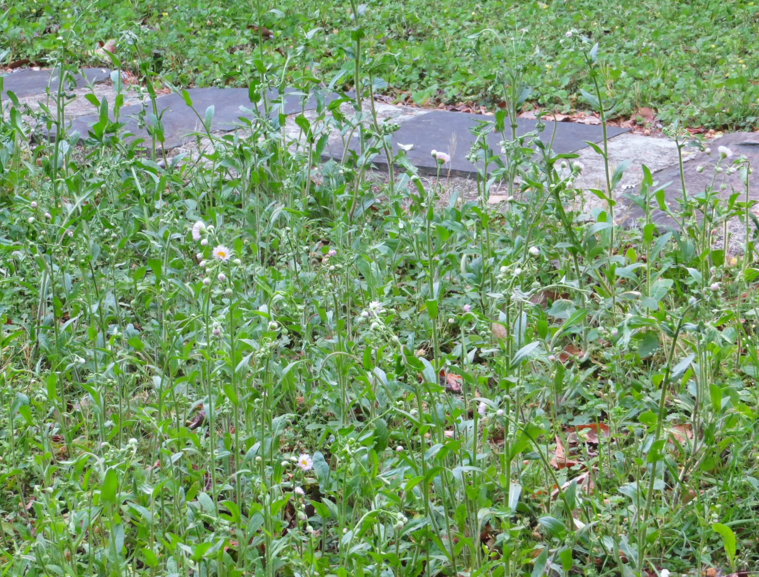 Bees and other insects feed on blooming fleabane, Erigeron pulchelllus, which has overtaken part of our front yard. This native wildflower forms dense stands when left alone to spread. It can be mown down in early summer, once the first round of flowering has finished, without harming the plants.