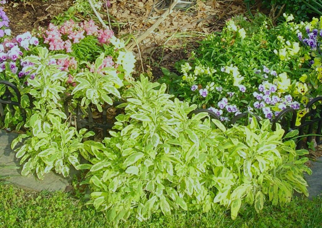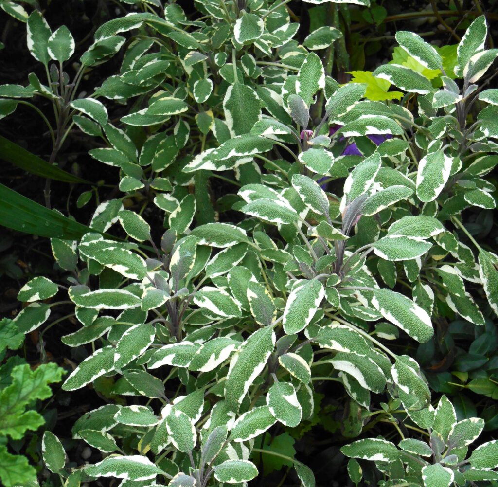 - ‘Tricolor’ sage, which has mottled green, white and purple leaves, purple sage