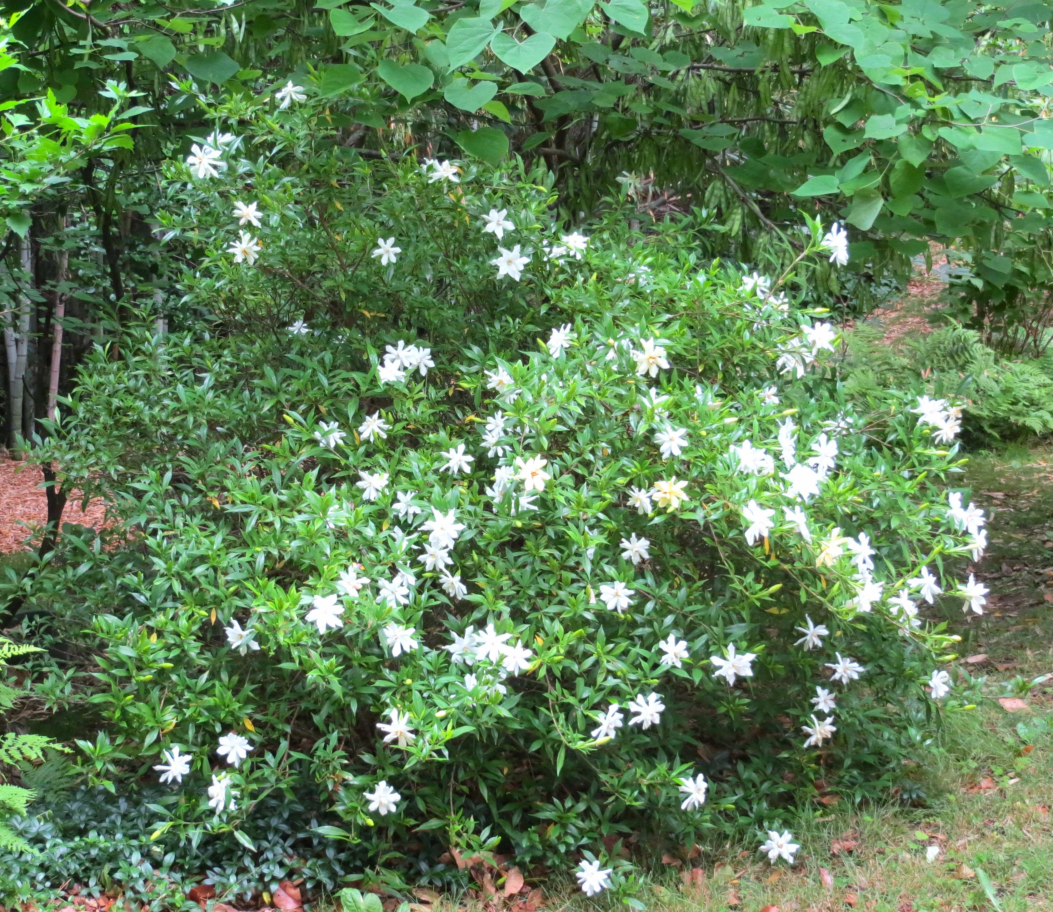 A Gardenia shrub purchased several years ago at a local grocery store blooms in the author’s back garden.