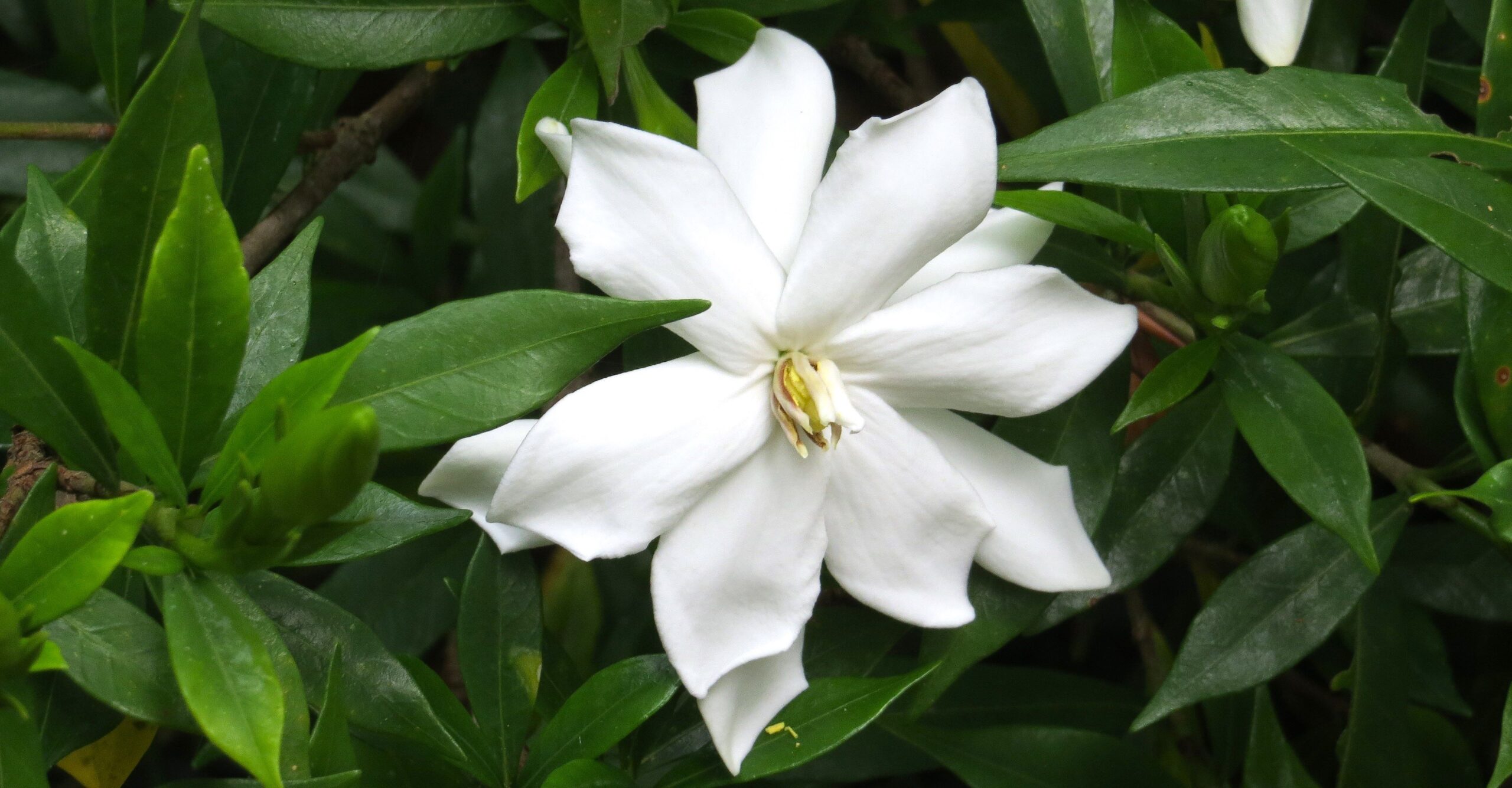 Gardenia’s shiny, evergreen leaves give this shrub presence throughout the year, even in the coldest months of winter. It is a beautiful addition to a garden landscape, growing in dappled sunlight or partial shade in USDA Zones 7-11. Gardenias thrive in our humid summers, blooming from early summer through early fall. Like autumn and winter blooming evergreen Camellias, Gardenia shrubs don’t require full sun to bloom prolifically. They prefer moist, organically rich acidic soil with a pH below 6. Provide shelter from the afternoon sun and from strong wind, both of which can damage this shrub.