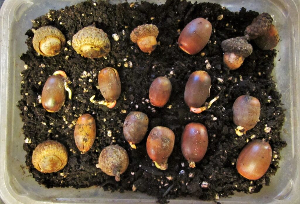 White oak acorns may begin to sprout on the ground after they fall.  The radicle, or embryonic root, breaks through the shell of the acorn in search of water and nutrients.  These trees develop roots during their first winter, and produce their first leaves the following spring.  Acorns from red oaks may not develop any roots until the spring.   Pro tip:  pour newly gathered acorns into a container of water to determine which are good and which are not.  Those that float may be fed to the squirrels.  Only those that sink are likely to germinate.
