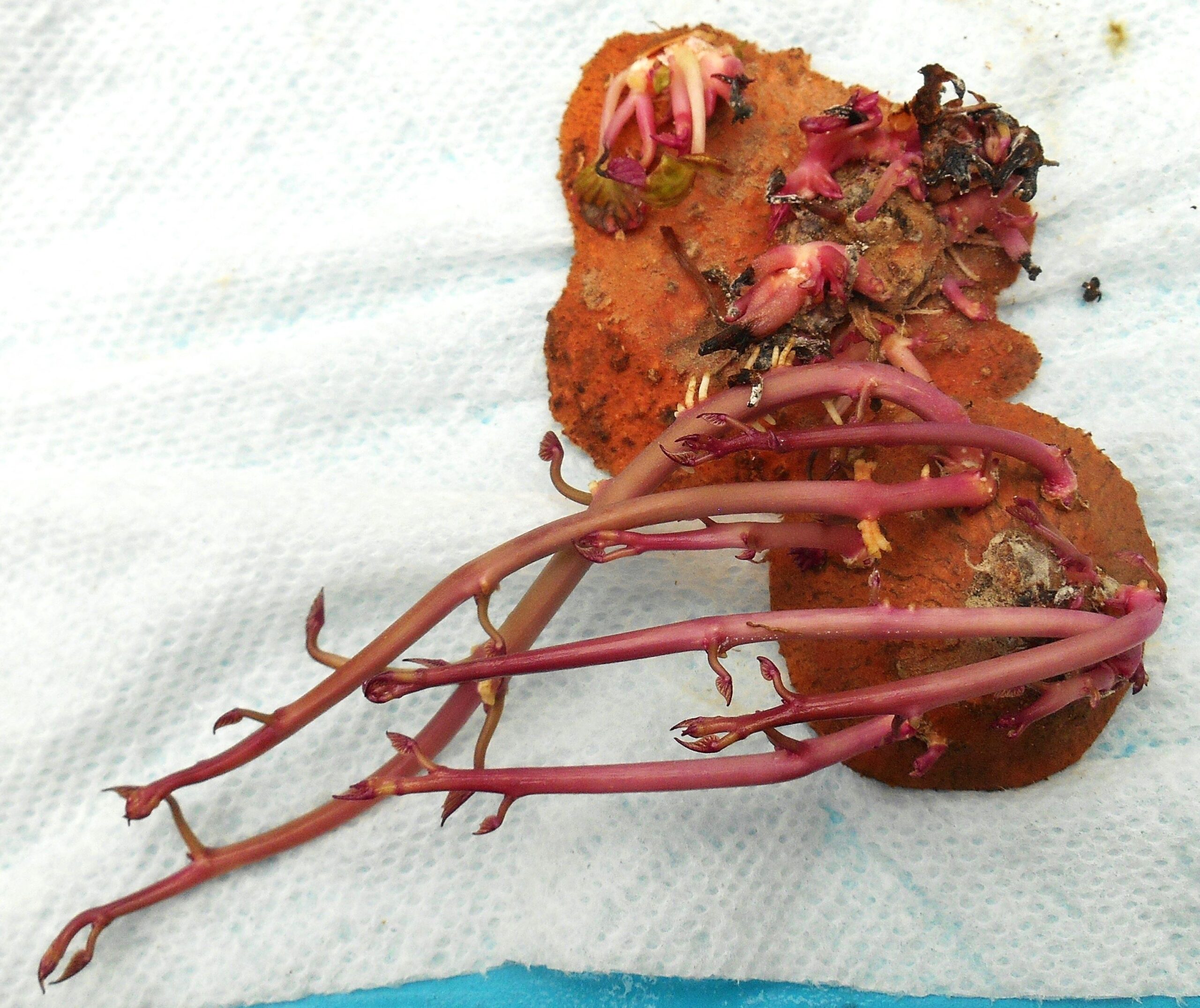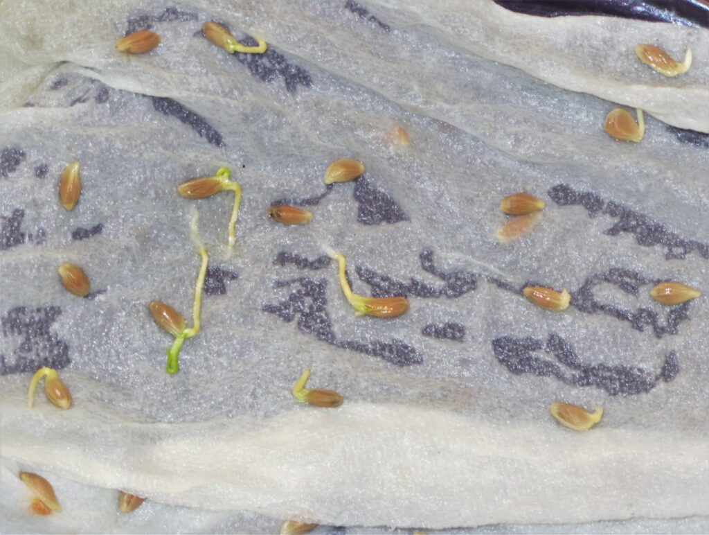 Lemon seeds germinated in damp towels kept near the warmth of the coffee pot.  The embryonic tree is already emerging from most of these seeds.  The radicles are whitish and the plumules are green.