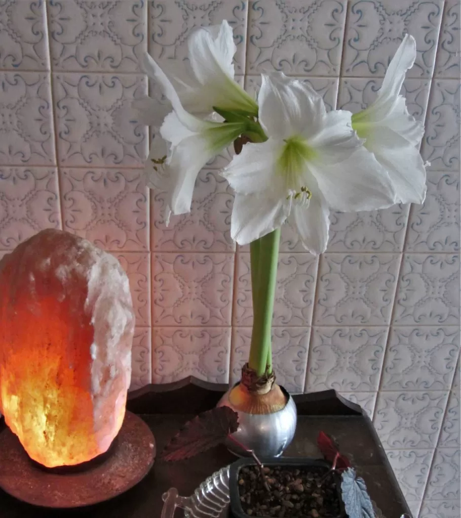 A plump, well-prepared bulb may re-bloom two or three times during the winter, supporting long leaves and stems holding multiple large lily-shaped flowers.  But if you cut the wax away, after the plant has bloomed, and set the bulb in a shallow pan of warm water, you’ll see roots begin to grow around the edges of the bulb within days.  They reappear from what is left of the bulb’s basal plate.  Once new roots appear, pot the bulb in good potting soil and keep it warm through the winter.  The bulb will rejuvenate to bloom for years to come.