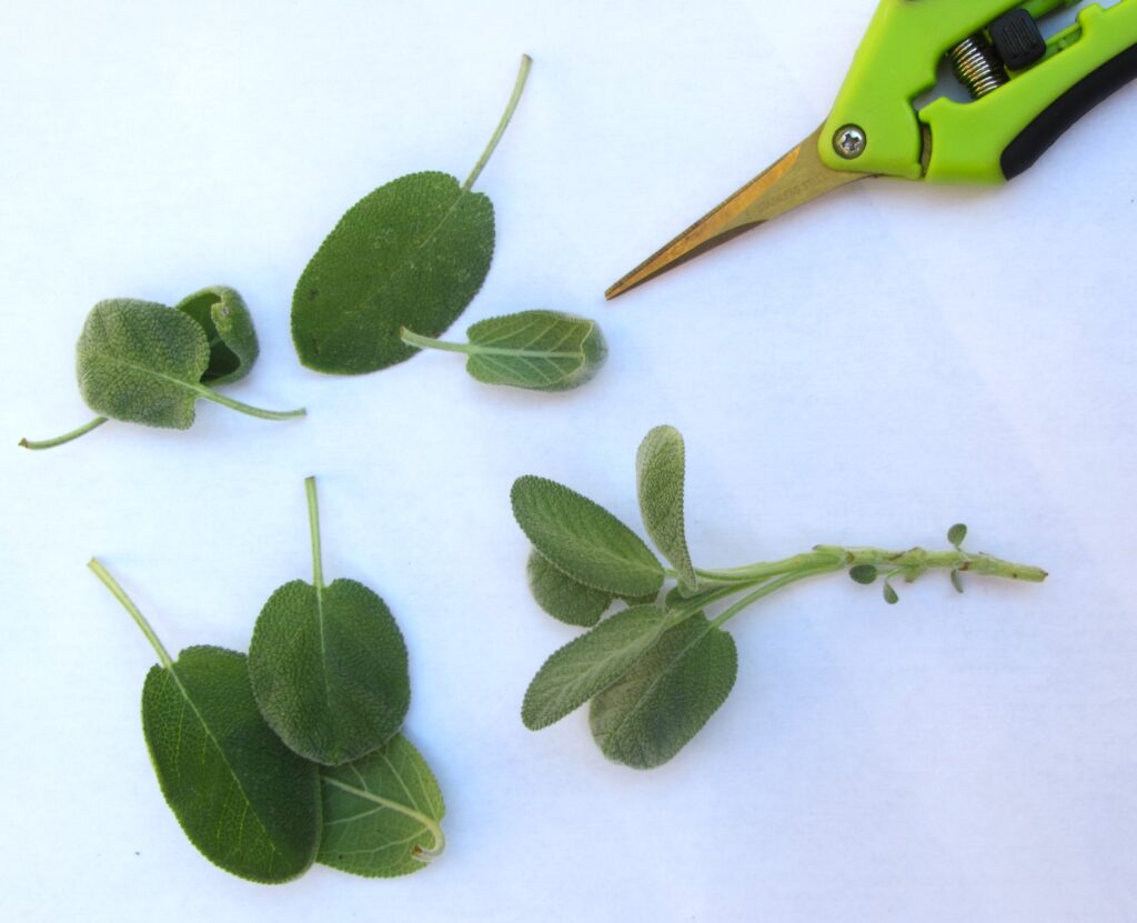 This sage softwood cutting is prepared to stick in moist sand or soil so it can root.  Dipping the end in rooting hormone before sticking it into the growing medium helps speed the rooting process.