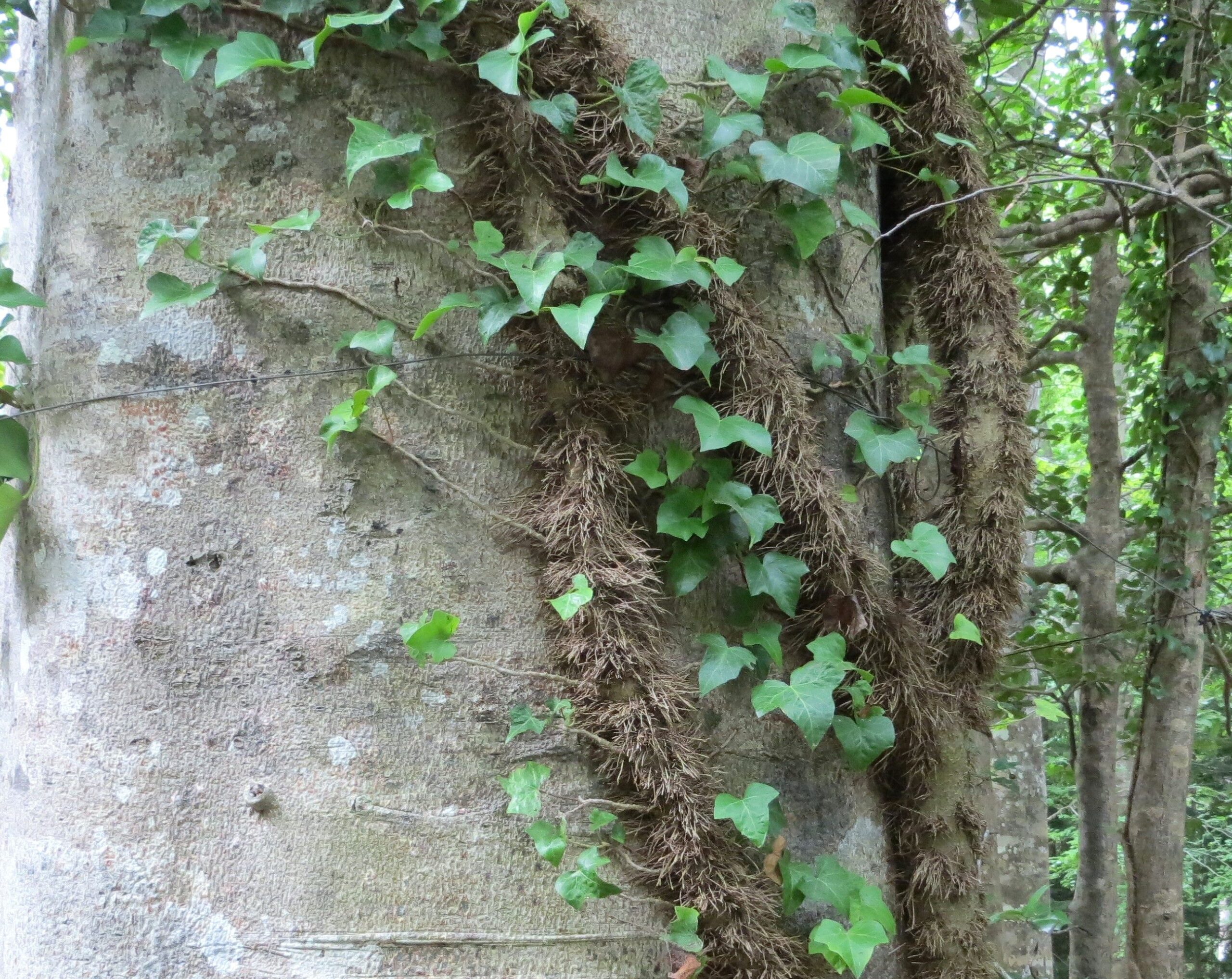 Ivy matures as it climbs, growing woody stems covered in tiny adventitious roots which collect dew and absorb moisture from the air.  The roots don’t penetrate the bark to steal food or moisture from the tree, however.   Ivy  has grown on this  beech tree for decades.