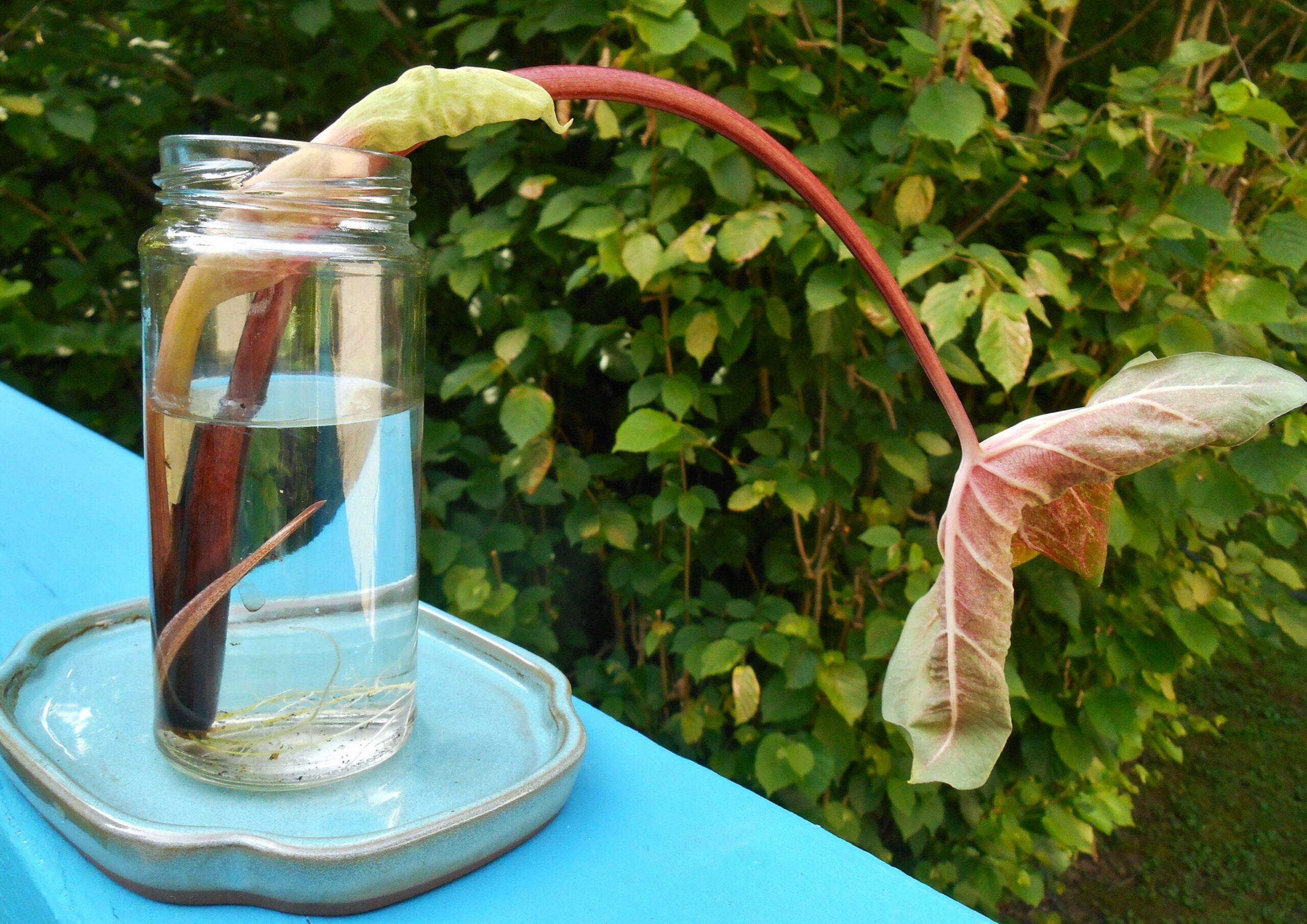 Caladium leaves will root in water so long as a bit of their tuber remains attached to the petiole.