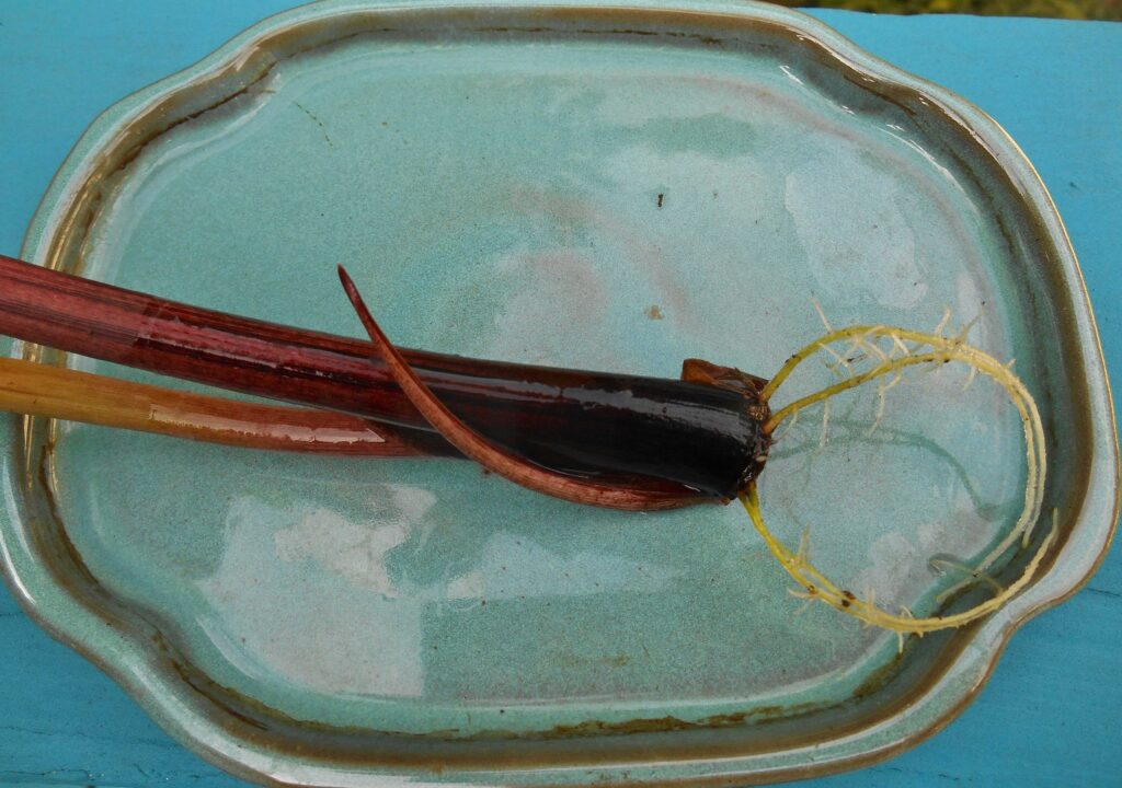 While most plants require their roots to survive, plants known as ‘geophytes’ can survive months each year as a bulb, a corm, a rhizome, or a tuber without stems, leaves, or roots.  Once suspended over water, or planted in moist soil, roots appear followed by new stems, leaves, and eventually flowers.  New plants can emerge from the dry, scaly or starchy storage unit that is actually a part of the plants’ stem or root system.