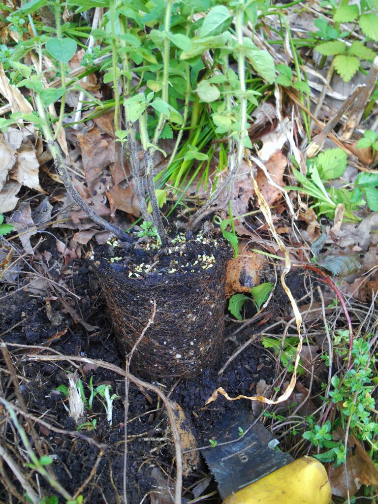 In February, while I’m pruning shrubs, I will often cut a longer stem into shorter cuttings to root.  Make sure to keep the stem oriented correctly ‘up and down’ if you cut a single stem into several pieces.  Sometimes, I’ll stick a trimmed cutting directly into the ground where I want it to root and permanently grow.  This method is ‘hit or miss’ because there are so many unknown variables with the soil quality, the weather, and animals that may attack (graze) the cutting.  But it works often enough to try again and again.