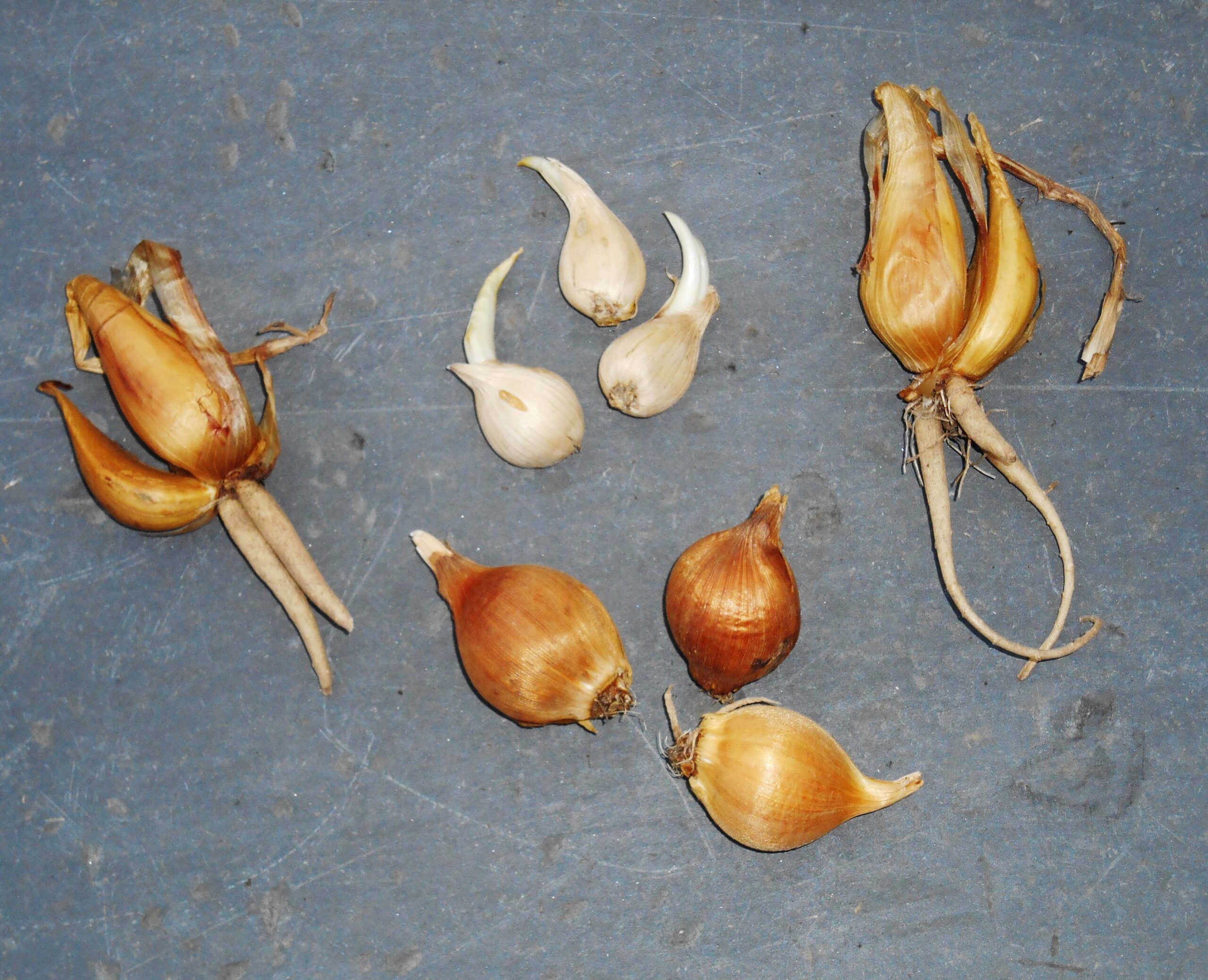 Garlic, onions, and shallots are all bulbs.  We eat them while they are dormant, but all can quickly grow new roots and send up new stems.