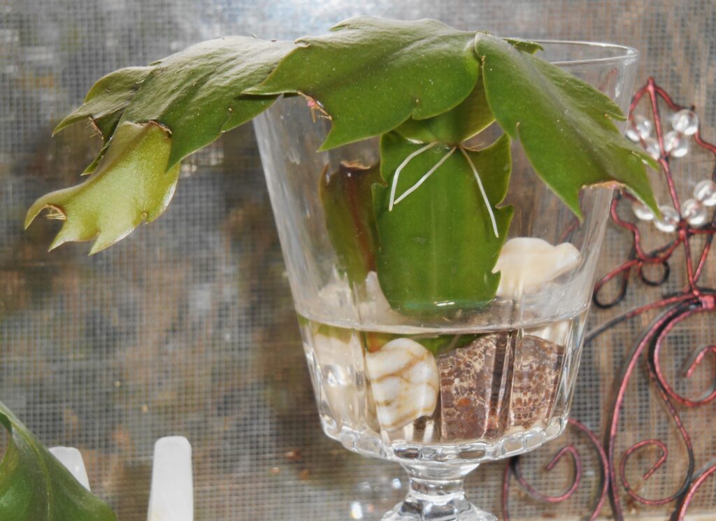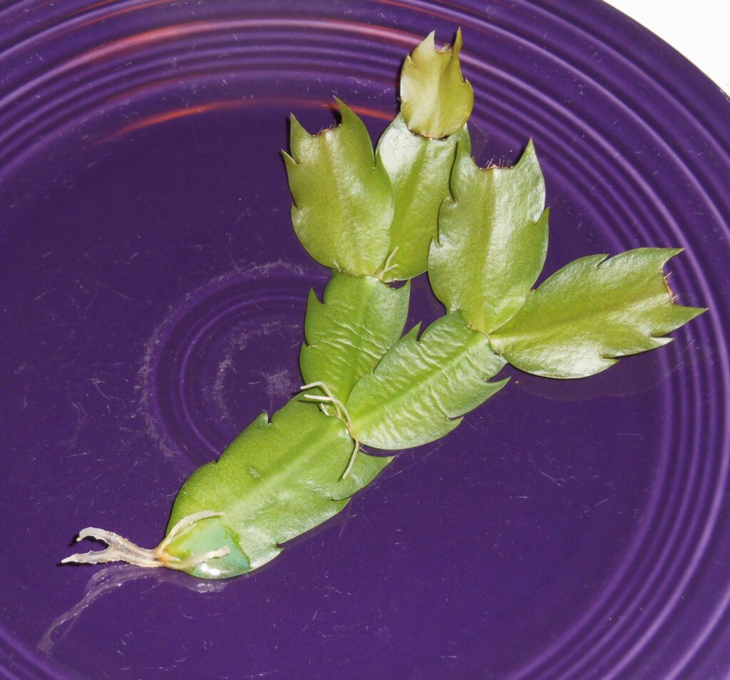 This broken piece of a Christmas cactus rooted in a glass of water.  Adventitious roots appeared at nodes even above the water line, reaching for the humidity in the air.