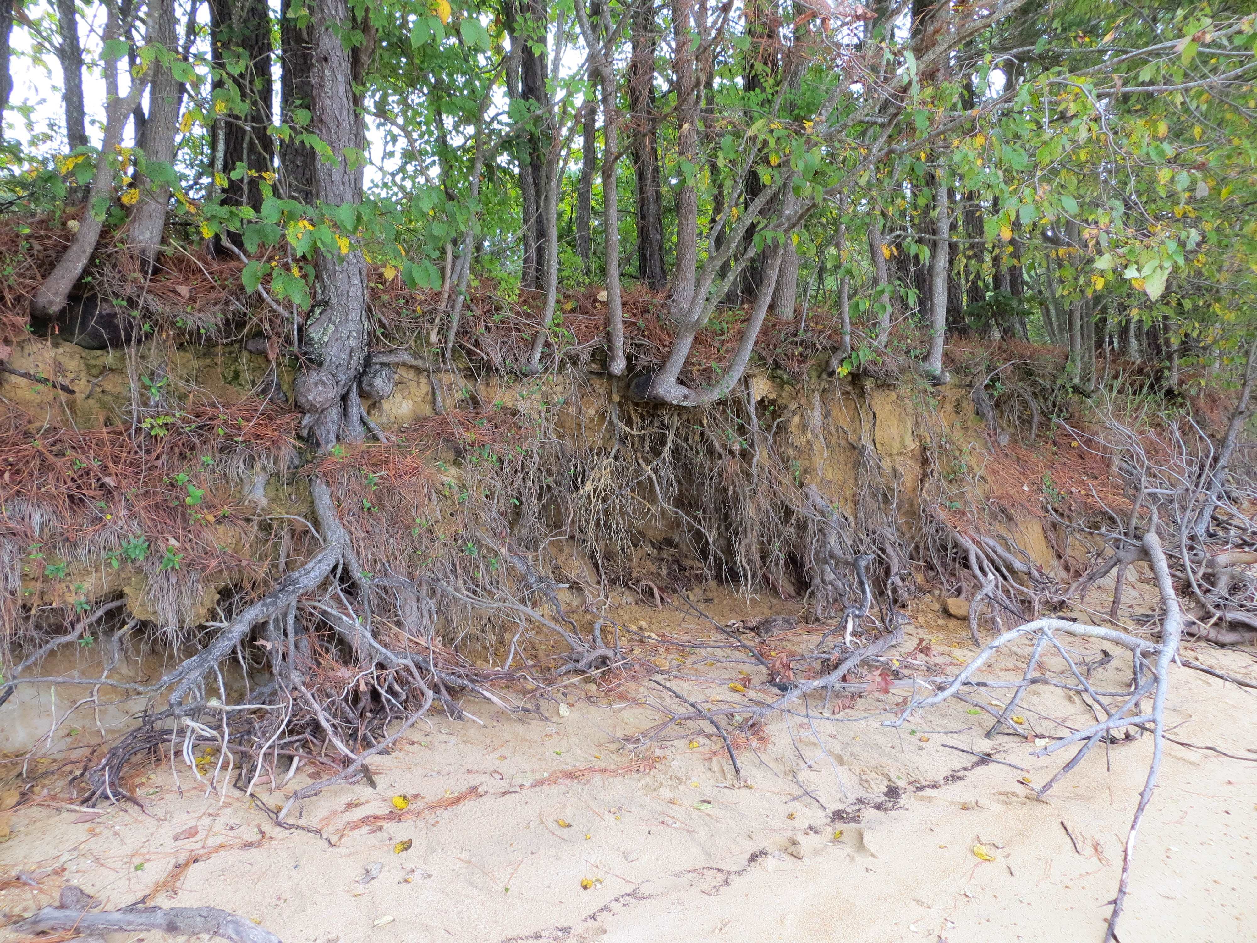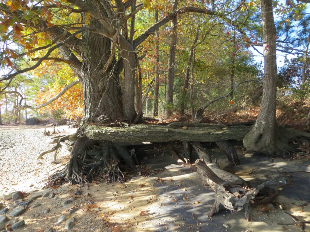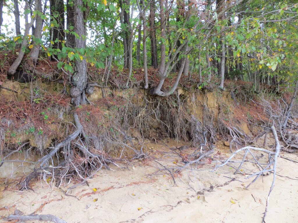 Waves and high tides on the James River have eroded the beach to expose the roots of trees growing along its shore. September 2025 along the Colonial Parkway near Jamestown Island.