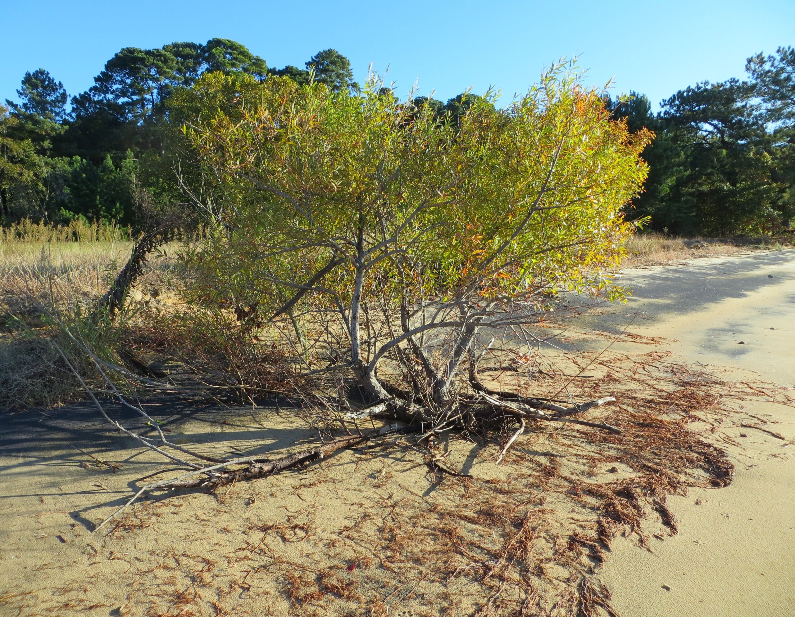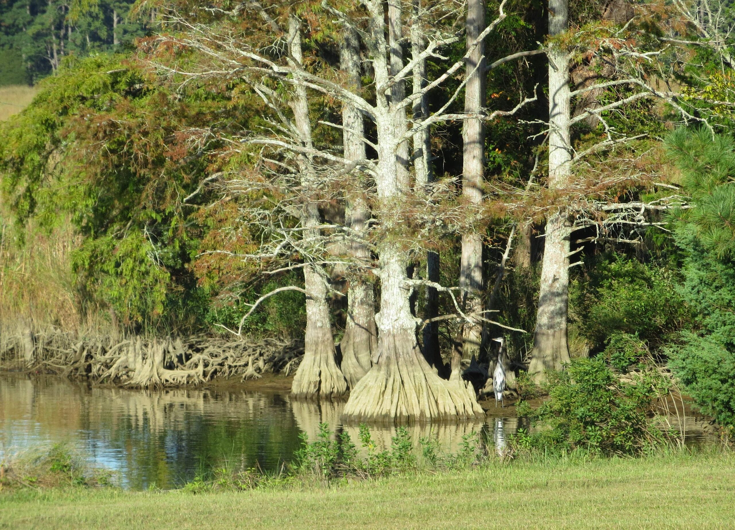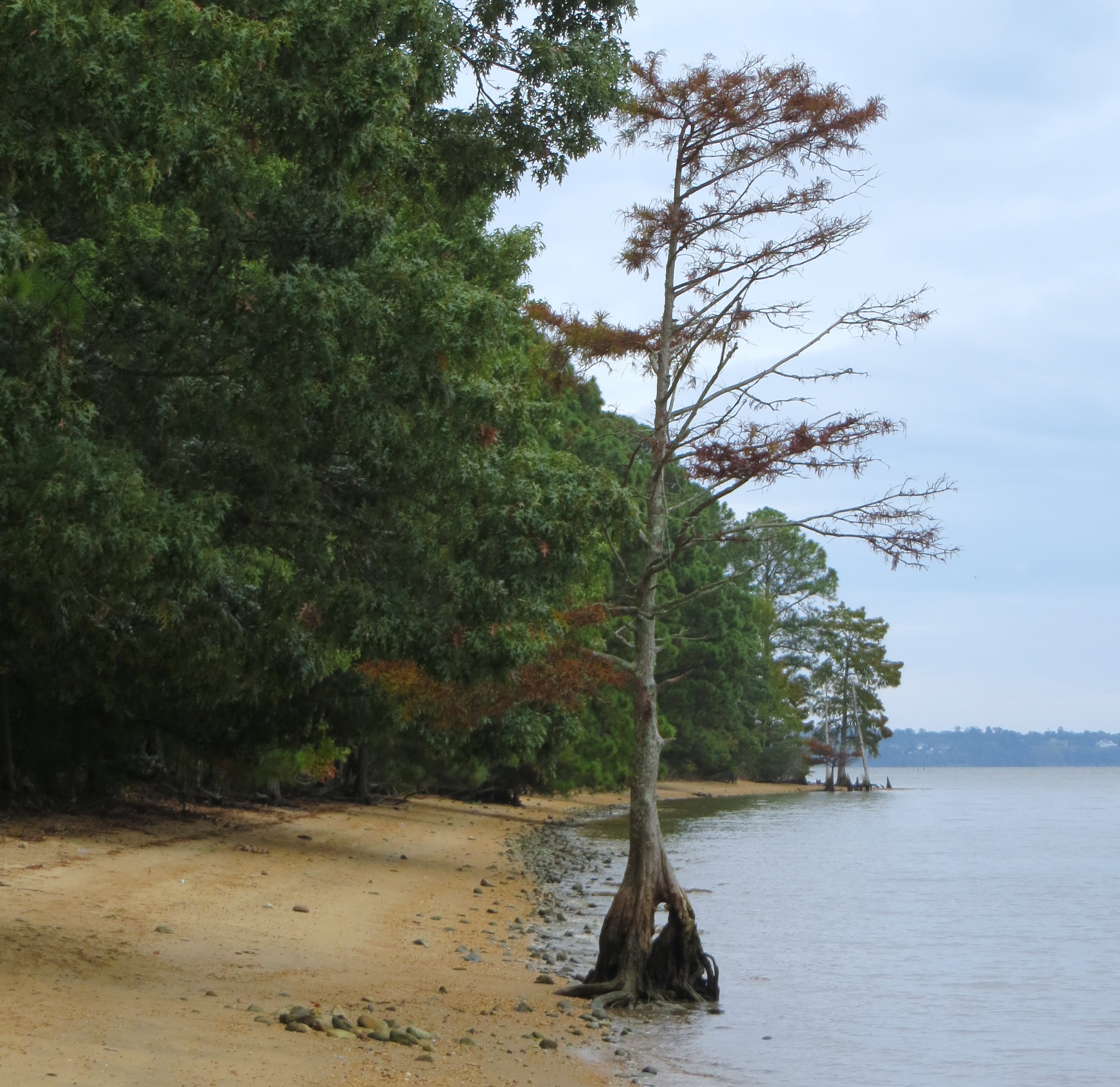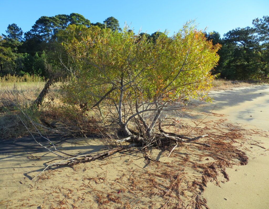 Bald cypress roots develop ‘knees’ which reach above the high tide line to help the tree’s roots breathe.  Taxodium distichum on Sandy Bay October 2025
