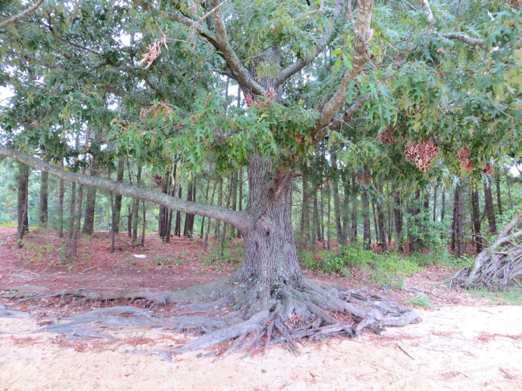 Trees and shrubs with extensive lateral root systems, like sumac, willow, bald cypress, and Forsythia, hold soil on slopes and shorelines to protect it against erosion from heavy rains, high tides, and wind-driven waves.  Even cherrybark oak, Quercus pagoda,  can grow on sandy river beaches, holding the soil for 15’ or more around its trunk.  Other trees, like some pines, figs, hollies, and oaks grow very long taproots, finding water deep underground during times of drought, and improving the soil with their massive, branching root systems.