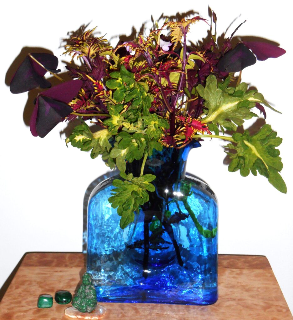 Coleus cuttings root in a vase.