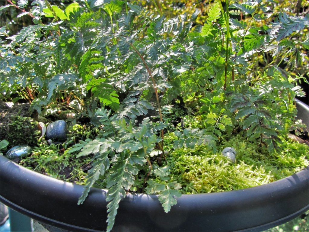 I’ve been lifting these baby ‘sporeling’ ferns from mosses in the yard, and from the plastic box where this all unfolded this spring quite accidentally, and then planting them into pots and around the garden. I used a few in fern tables I’ve built this summer, and I’ve given a few to gardening friends. Growing my own ferns is much like the luxury of growing one’s own summer tomatoes. Such a pleasure to raise them at home and not need to run to the store for every fresh tomato sandwich- or each new fern included in a potted arrangement.