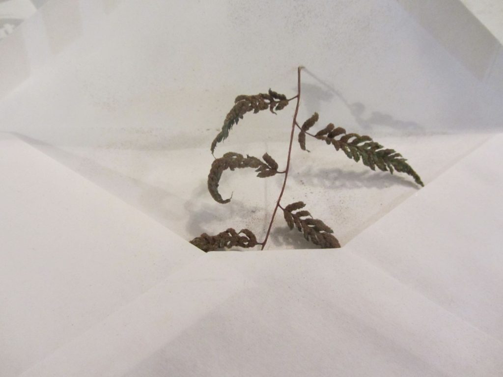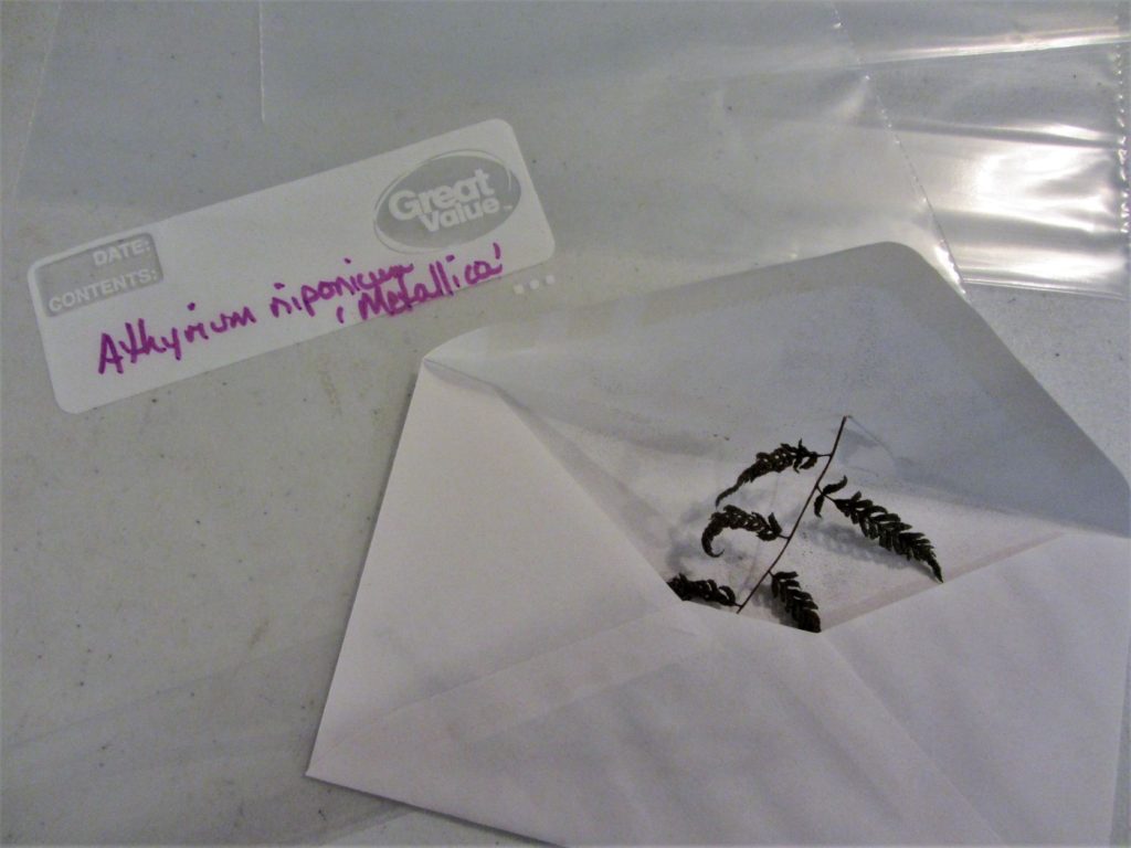 The method I’ve adopted, as described in the HFF booklet, suggests putting a clipping of a few pinnules from a ripe fertile frond into an envelope. It is easy enough to note the type of fern collected and the date on the envelope, and then seal it up until the frond has dried and dropped its spores. Sowing the released spores from the envelope is easier than some other methods of sowing spores. I’ve been resealing the envelopes to allow more spores to collect for a later sowing, or even to share. Depending on the genus, spores may remain viable for a few days or a few years.