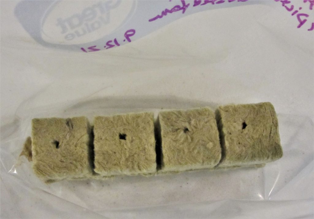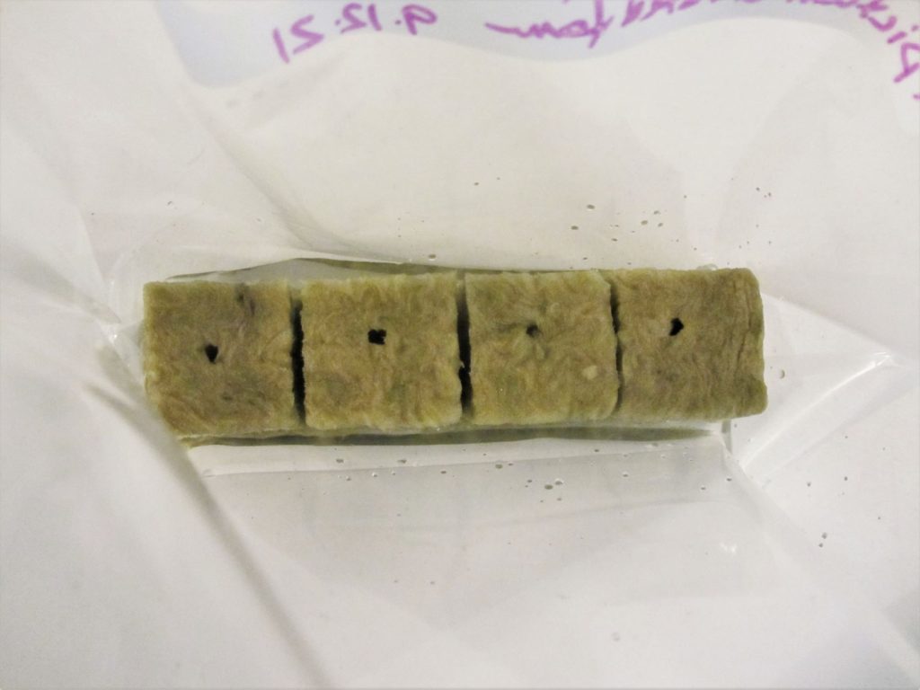 I liked Dr. Peter Podaras’s procedure in which he sowed spores directly onto either floral Oasis foam or rockwool. Since rockwool is sold for propagation of seeds and cuttings, I am going to assume it is already sterile enough for spores. I cut blocks of rockwool to fit the bottom of gallon sized zip-lock bags.