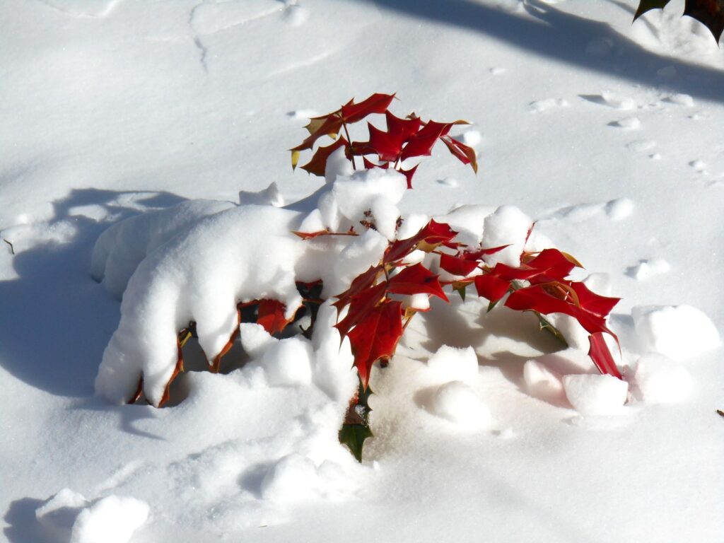 Some evergreen plants, like Oregon grape holly, turn red to help withstand the cold.