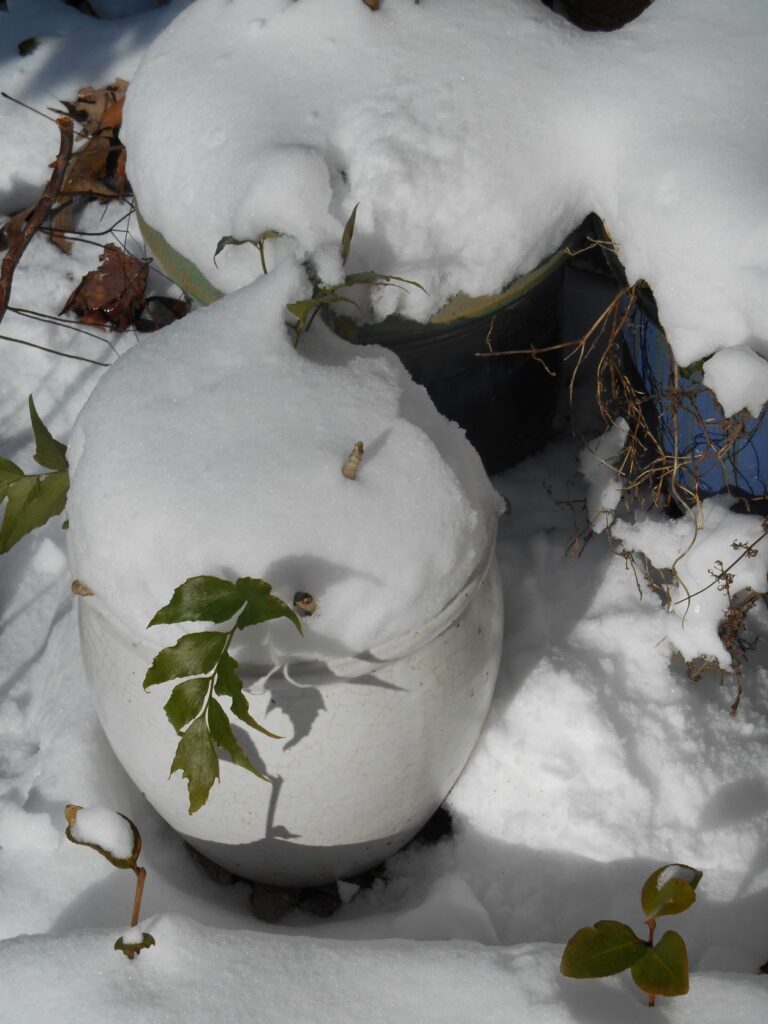 Here in Zone 7b, we don’t have our routines established for dealing with extreme weather.  In colder climates, many gardeners routinely wrap shrubs in layers of burlap or row cover material to protect evergreen leaves from damaging cold winds.  We just have to think through which plants we need to save and protect, and then improvise with the materials we have at hand.